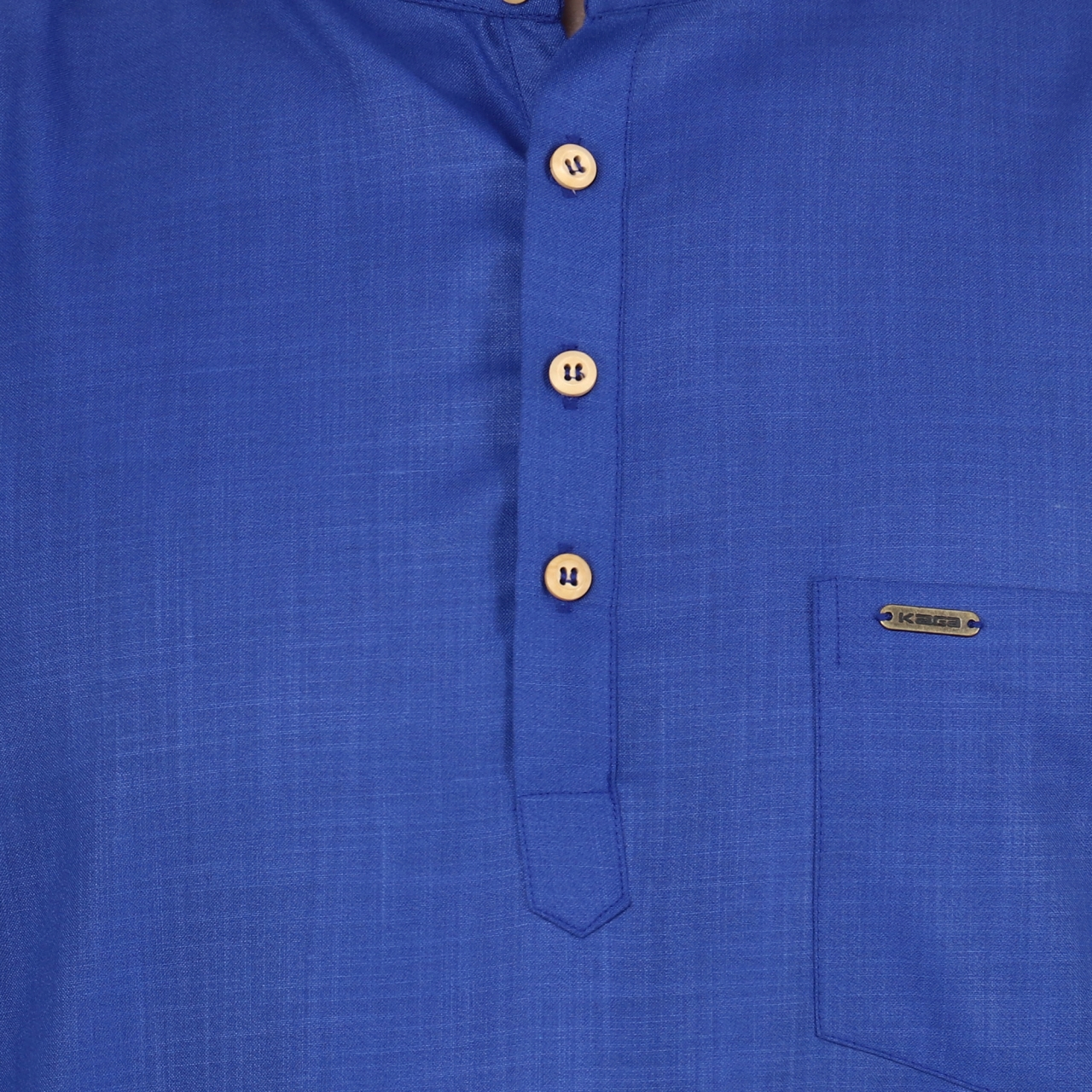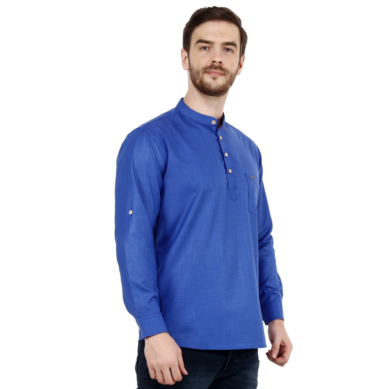 Ultramarine Blue solid straight short kurta has a man darin collar full sleeves with roll-up tab, Button closure and one patch pocket.