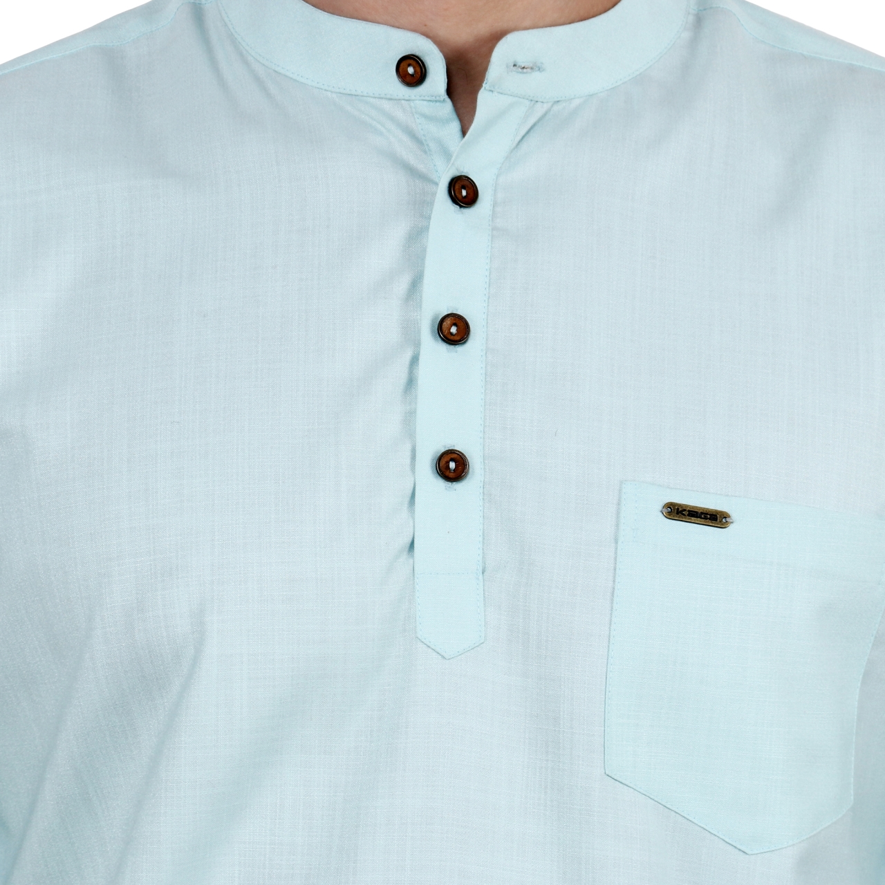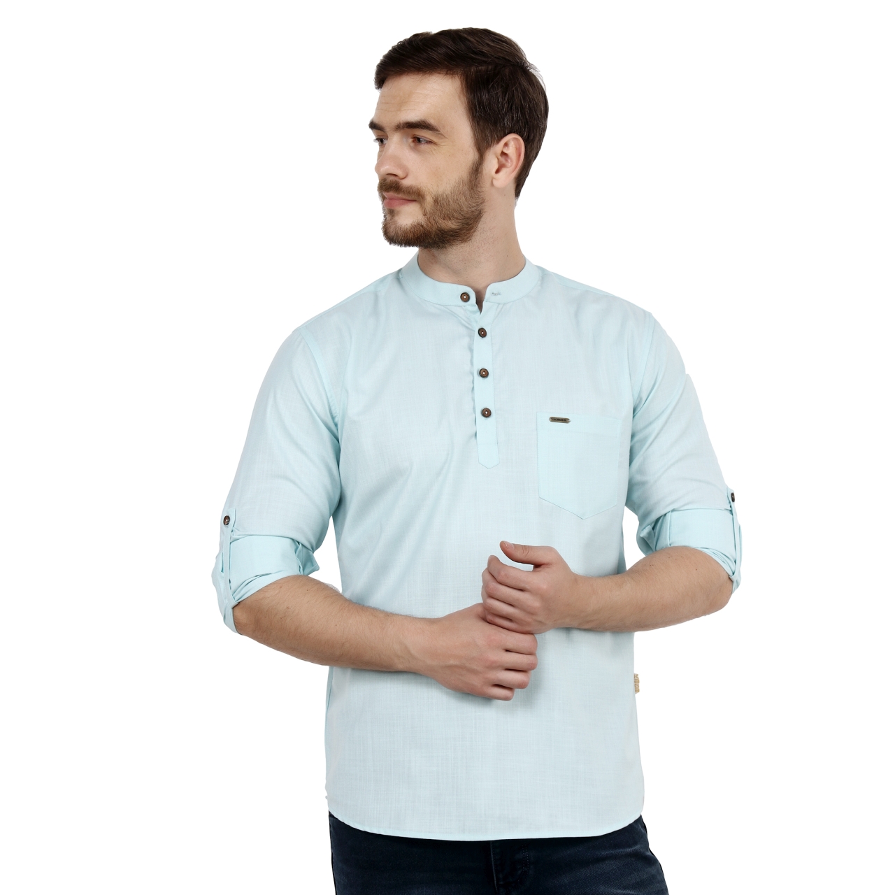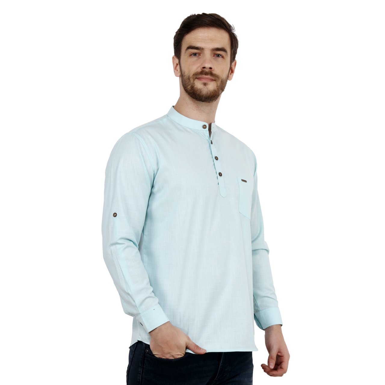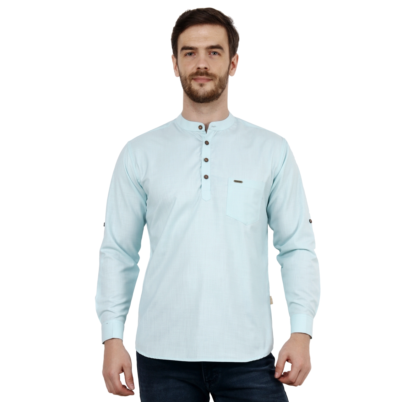 Light Turquoise Green solid straight short kurta has a man darin collar full sleeves with roll-up tab, Button closure and one patch pocket.