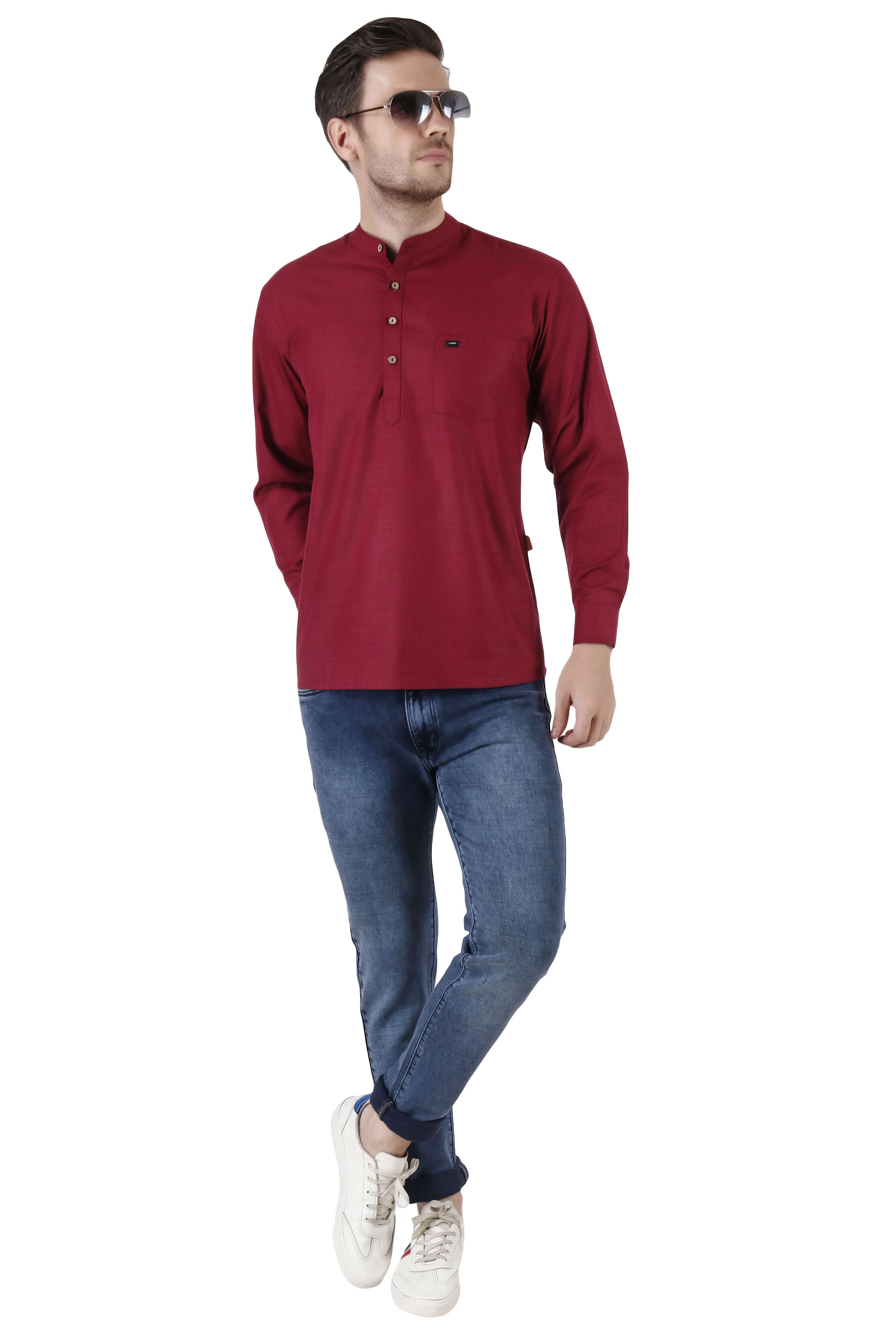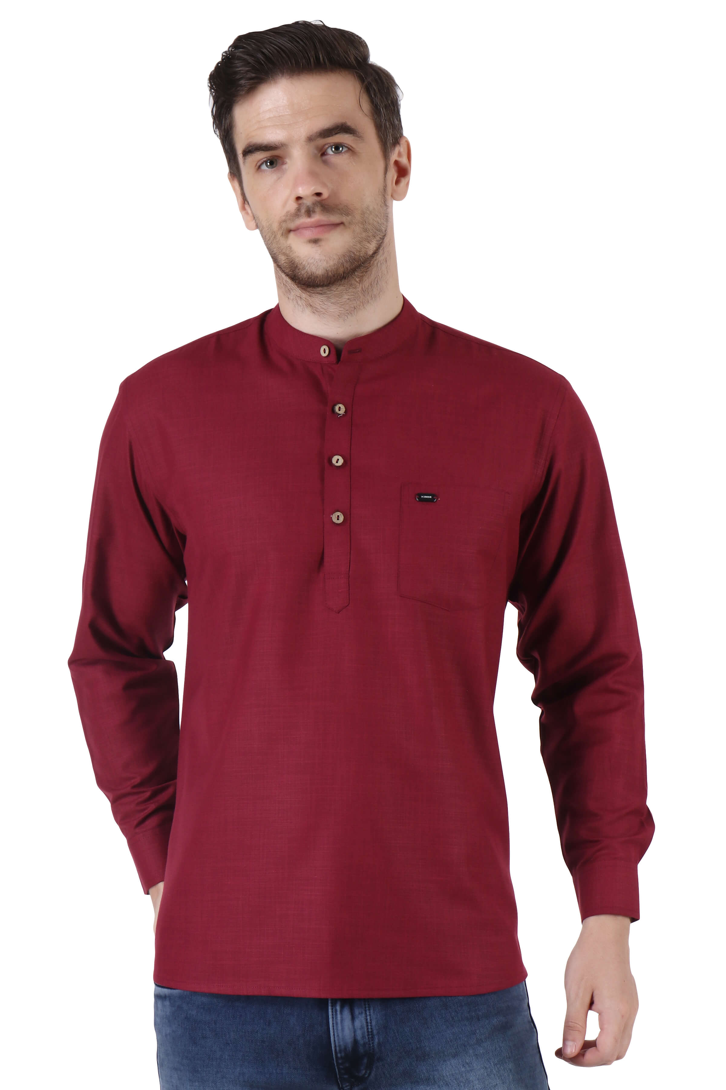 Wine Red solid straight short kurta has a man darin collar full sleeves with roll-up tab, Button closure and one patch pocket.
