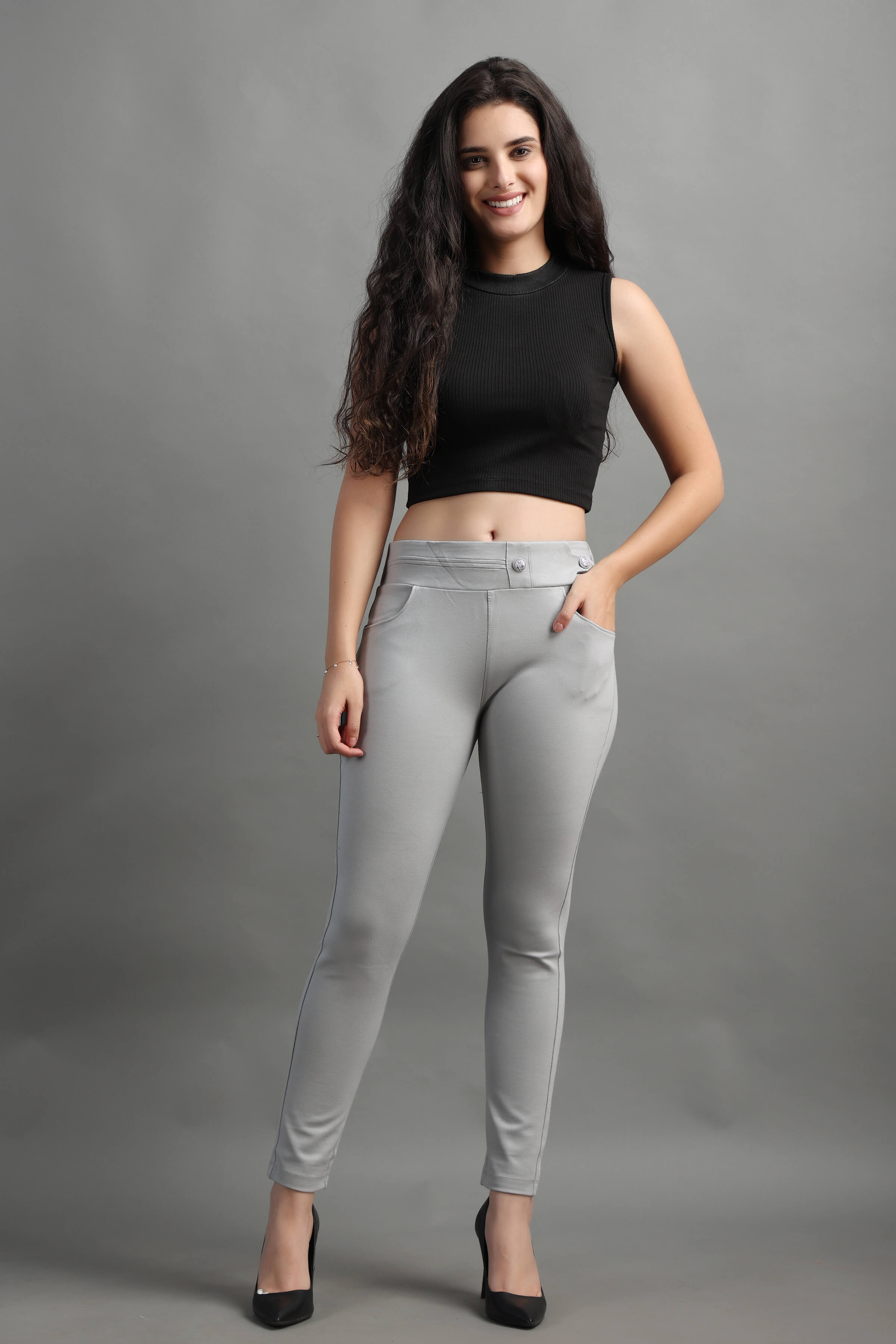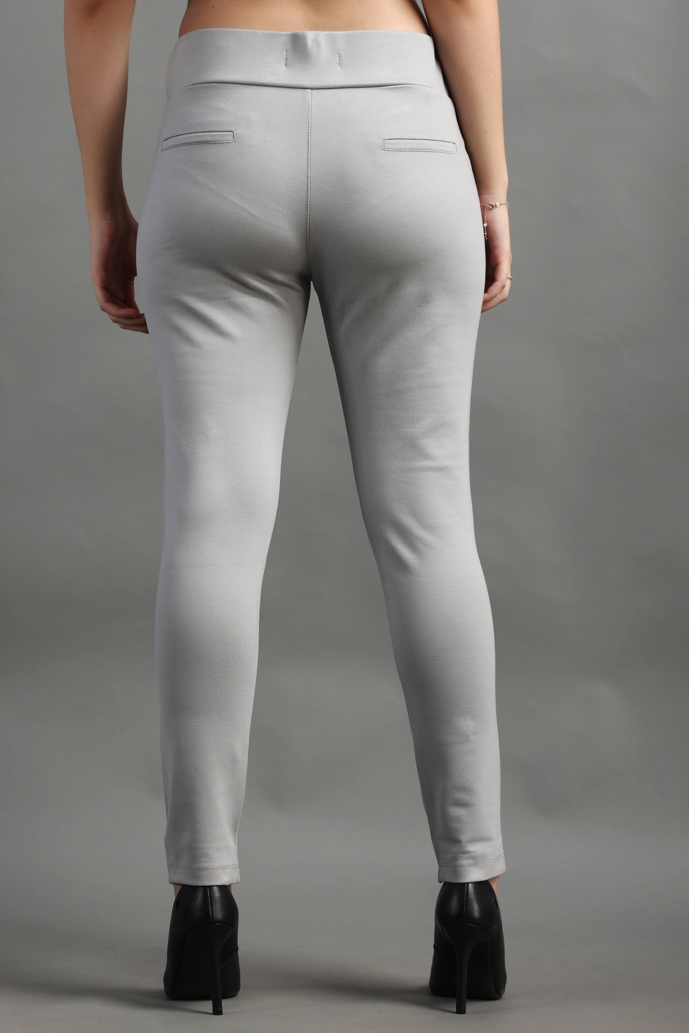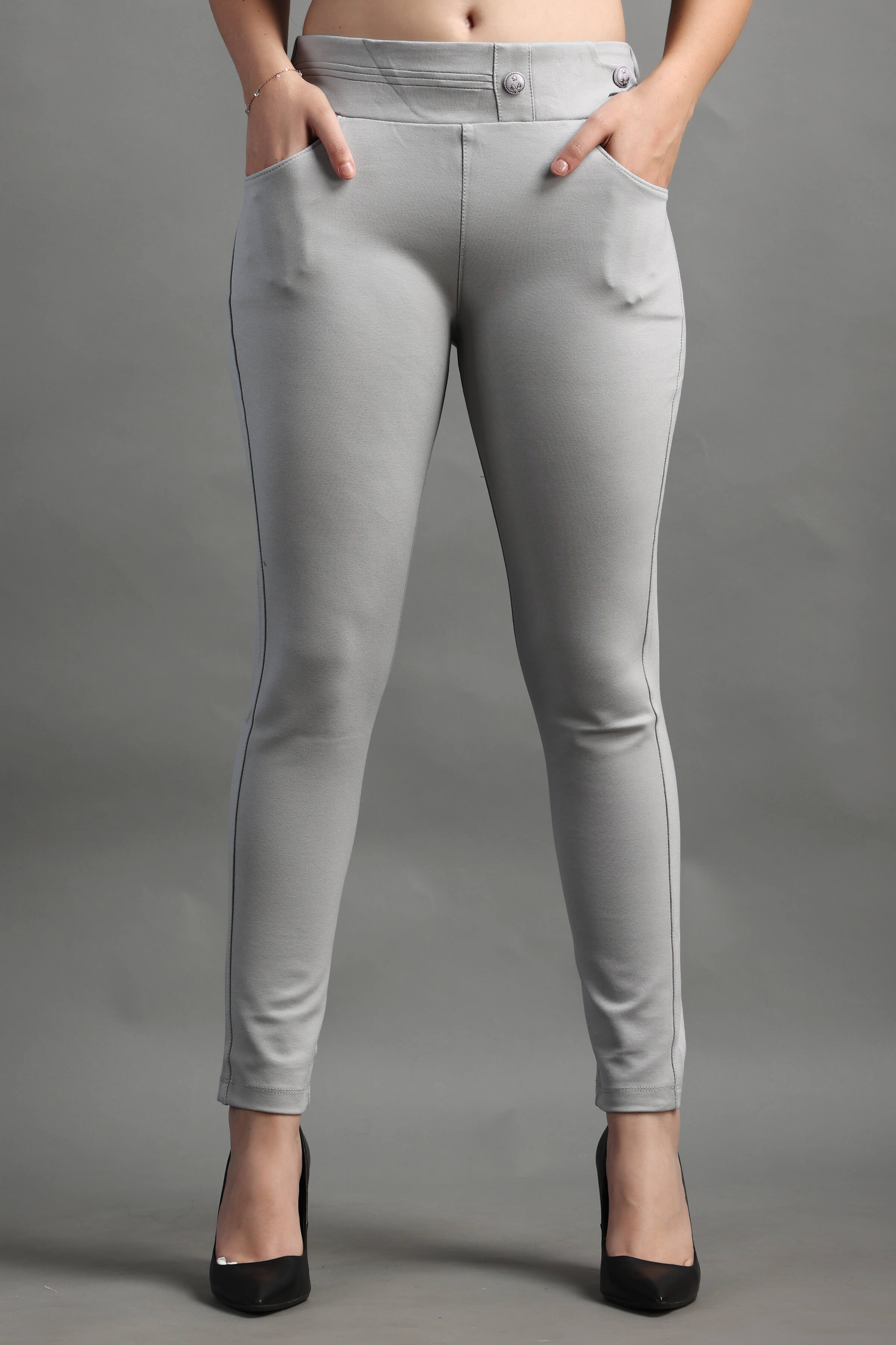 L.Grey color Stylish and well fitted Jegging, Breathable and Premium smooth fabric for all-day comfort, has an elasticated waistband for extra comfort and two front pockets, All styling accessories (elastic, zipper and buttons) used on the garment are of the best quality.
