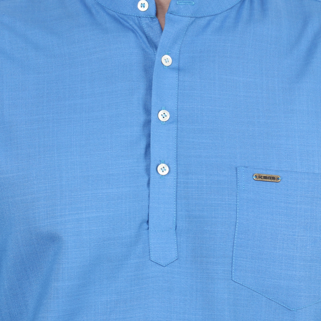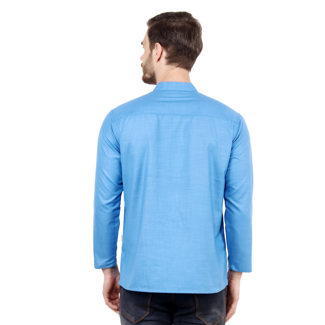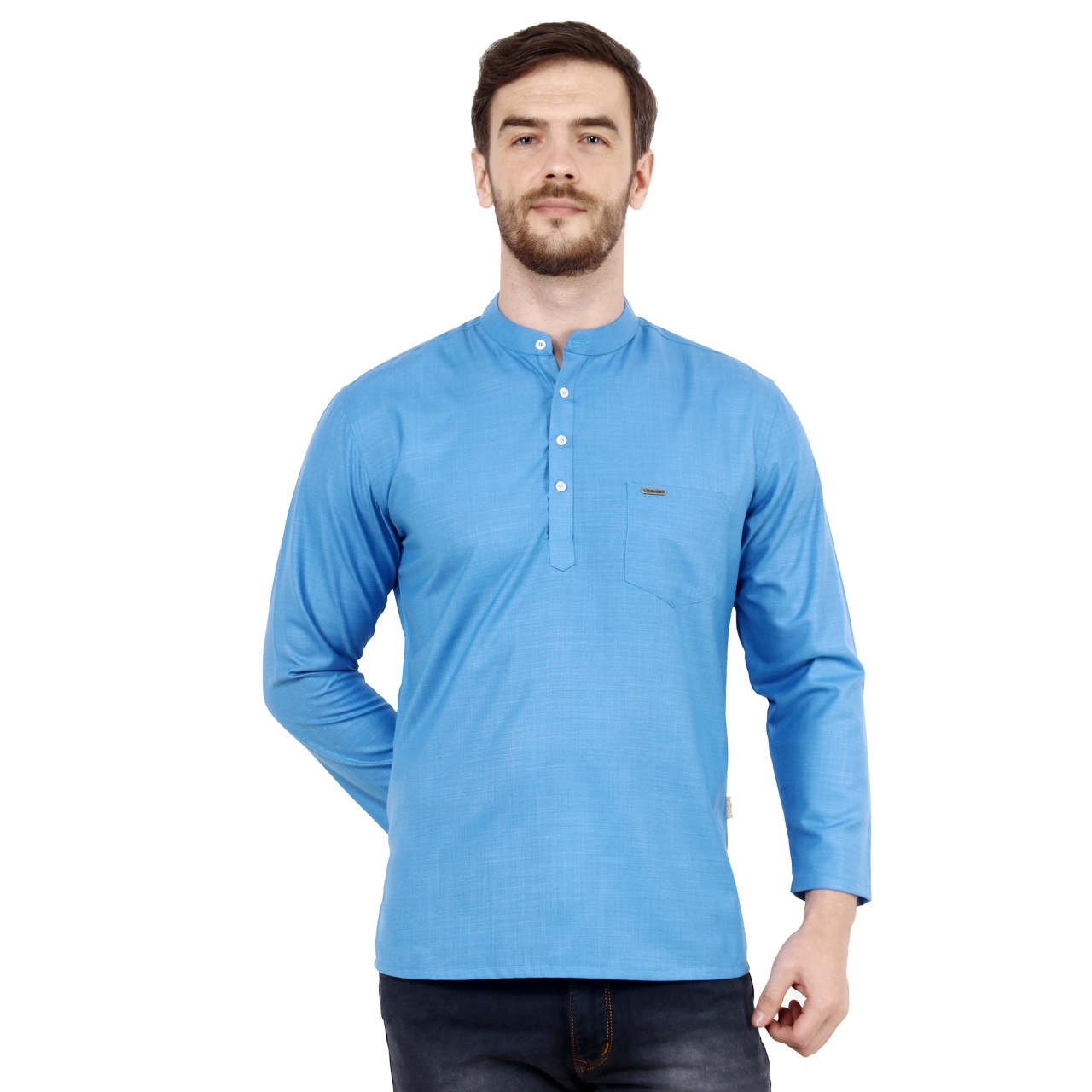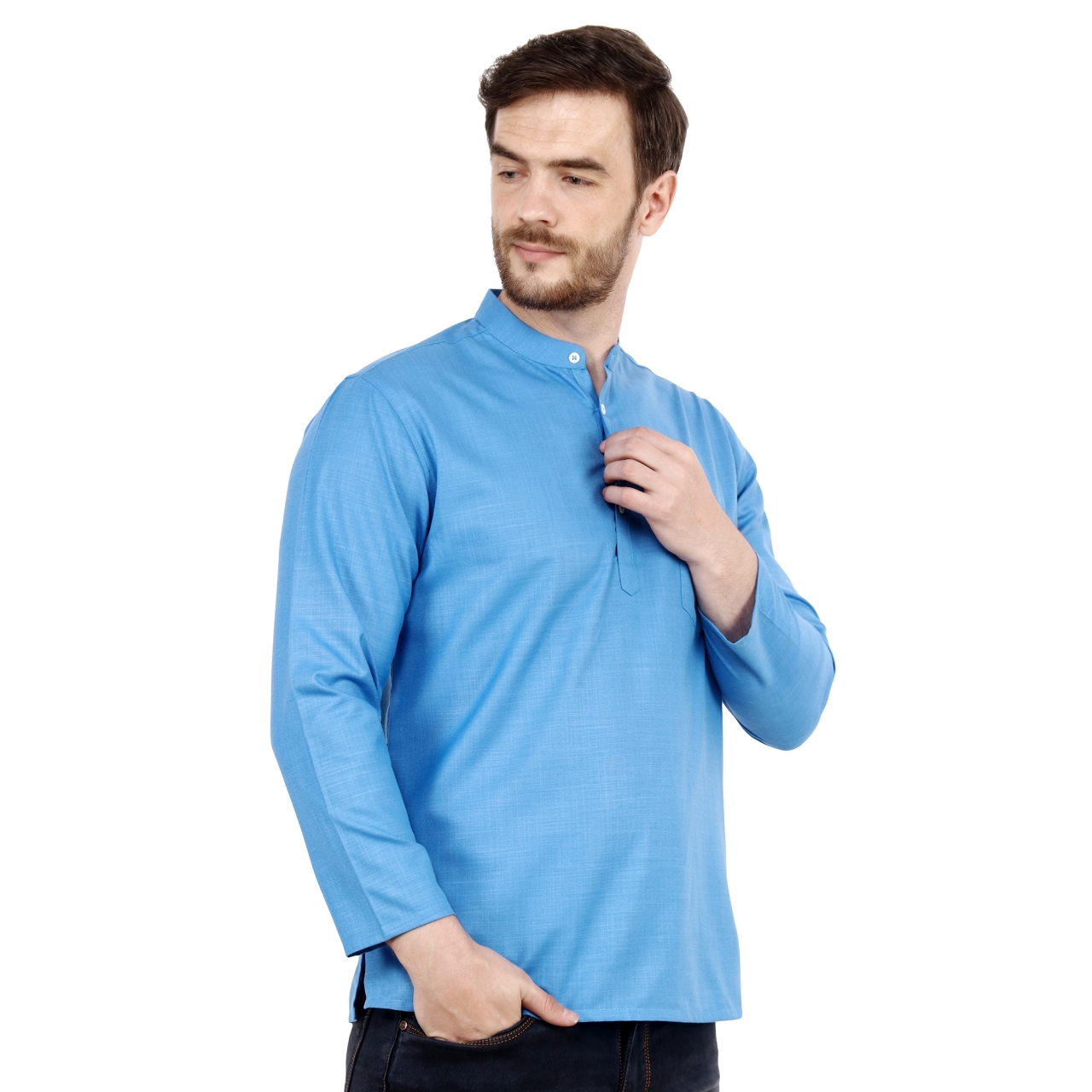 Light Blue solid straight short kurta has a man darin collar short sleeves with roll-up tab, Button closure and one patch pocket.
